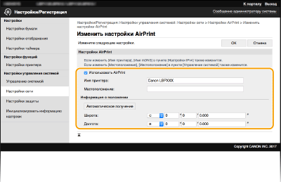 Позволяет проверять значения, введенные в настройки AirPrint, такие как место установки аппарата. Можно нажать [Изменить], чтобы изменить настройки.