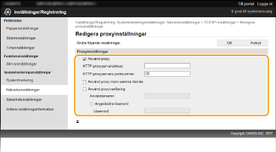 En proxy (eller HTTP-proxyserver) avser en dator eller ett program som utför HTTP-kommunikation för andra enheter, särskilt vid kommunikation med resurser utanför nätverket, till exempel vid surfning på webbplatser. Klientenheterna ansluts till det externa nätverket via proxyservern och kommunicerar inte direkt med externa resurser. Att ställa in en proxy underlättar hanteringen av trafik mellan interna och externa nätverk men blockerar också obehörig åtkomst och befäster antivirusskyddet vilket ger utökad säkerhet. När du använder Google Cloud Print för att skriva ut över Internet, kan du öka säkerheten genom att ställa in en proxy. När du ställer in en proxy måste du se till att du har nödvändig proxyinformation, däribland IP-adress och portnummer samt ett användarnamn och lösenord för autentisering.