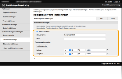 Här kan du kontrollera värdena som har angetts för AirPrint-inställningarna, t.ex. namnet och platsen för enheten. Du klickar på [Redigera] om du vill ändra inställningarna.