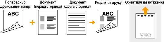 У цьому розділі в основному описується, як правильно завантажити документ, на якому вже щось надруковано (якою стороною догори та в якій орієнтації). Опис загальної процедури завантаження паперу в касету див. в розділі Завантаження паперу в касету або Завантаження паперу в універсальний лоток.