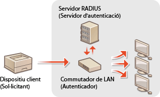 La informació d'autenticació s'envia a un servidor RADIUS, el qual, un cop feta la comprovació pertinent, permet o rebutja la comunicació amb la xarxa en funció del resultat de l'autenticació. Si l'autenticació falla, un commutador de LAN (o un punt d'accés) bloqueja l'accés des de fora de la xarxa. L'equip es pot connectar a una xarxa 802.1X com a dispositiu client.