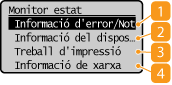 En seleccionar <Monitor estat>, es mostra una pantalla en què podeu comprovar el progrés del processament de documents, així com l'estat de l'equip (quantitat restant de tòner al cartutx de tòner, etc.) i les opcions de xarxa, com ara l'adreça IP de l'equip.