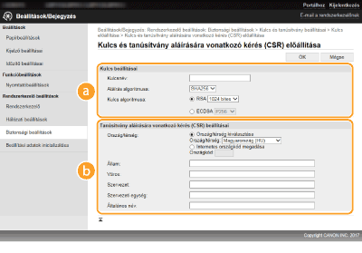 A készülék által létrehozott tanúsítványokon nincs hitelesítésszolgáltatói aláírás, ami bizonyos eszközökkel szemben kommunikációs hibához vezethet. Ahhoz, hogy a hitelesítésszolgáltató kibocsássa az aláírásával ellátott tanúsítványt, először be kell szereznie a CSR (tanúsítvány-aláírási kérés) adatait. Ezeket a rendszergazda tudja létrehozni a Távoli felhasználói felületen. Ha már kibocsátották a tanúsítványt, regisztrálja azt a kulccsal a korábban létrehozott tanúsítvány-aláírási kéréssel.
