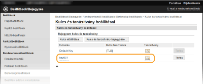 Ha a kulcsot és a tanúsítványt valamelyik funkció használja, ha például a „[TLS]” felirat látható a [Kulcs használata] mezőben, a kulcs és a tanúsítvány nem törölhető. Ebben az esetben a kulcs törlése előtt ki kell kapcsolni a funkciót, vagy le kell cserélni a kulcsot és a tanúsítványt.