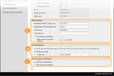 A Bonjour által meghonosított mDNS (multicast DNS) olyan protokoll, amely a DNS használata nélkül társítja egymáshoz az állomásnevet és az IP-címet. Az mDNS engedélyezéséhez jelölje be a jelölőnégyzetet, majd adja meg az mDNS-nevet az [mDNS-név] szöveges mezőben. [DHCP kiegészítő beállításai][Gazdanév megszerzése]