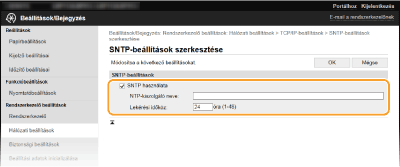 Jelölje be a [SNTP használata] jelölőnégyzetet, és adja meg a szükséges beállításokat.
