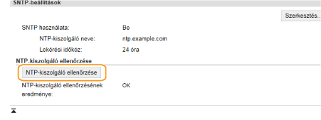 A bejegyzett kiszolgálóval folytatott kommunikáció állapotának megtekintéséhez kattintson a [Beállítások/Bejegyzés]  [Hálózati beállítások]  [TCP/IP-beállítások]  [NTP-kiszolgáló ellenőrzése] pontokra az [SNTP-beállítások] között. Ha megfelelő kapcsolat jött létre, akkor az alábbi eredmény jelenik meg. Ezzel a művelettel nem állítja át a rendszeridőt.