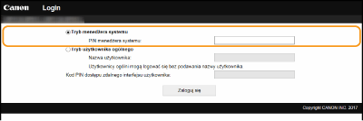 Wprowadź prawidłowy kod PIN w polu [PIN menedżera systemu] i zaloguj się w trybie menedżera systemu.