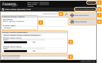 Po zalogowaniu się do Zdalnego interfejsu użytkownika zostanie wyświetlona następująca strona główna. W tej części opisano podstawowe czynności, a także elementy wyświetlane na stronie głównej.