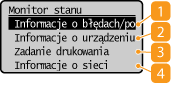 Po wybraniu przycisku <Monitor stanu> zostanie wyświetlony ekran umożliwiający sprawdzenie postępu przetwarzania dokumentów, a także stanu urządzenia (np. ilości toneru w zasobniku) oraz ustawień sieciowych (np. adres IP urządzenia).