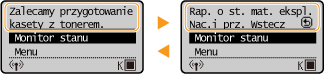 W niektórych sytuacjach po wystąpieniu błędu wyświetlone zostają wskazówki podające, jak na niego zareagować. Aby rozwiązać problem, należy postępować zgodnie z instrukcjami na ekranie. Poniżej jako przykład pokazano ekran wyświetlany w przypadku zacięcia papieru.