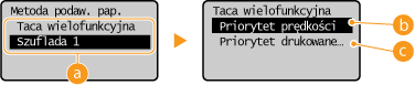 Obsługiwane rodzaje papieru), opcja <Priorytet prędkości> ma zastosowanie dla źródła papieru. W tym wypadku należy załadować papier w sposób odpowiedni dla ustawienia <Priorytet prędkości> (