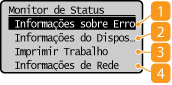Quando seleciona <Monitor de Status>, aparece um ecrã que permite verificar o progresso do processamento de documentos, bem como o estado da máquina (quantidade de toner restante no cartucho de toner, etc.) e as definições de rede como, por exemplo, o endereço IP da máquina.