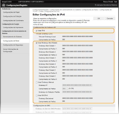 Os endereços IPv6 da máquina podem ser configurados através da UI Remota. Antes de definir endereços IPv6, verifique as definições de endereço IPv4 (Ver as definições de IPv4). É necessário configurar as definições corretas de IPv4 para poder utilizar endereços IPv6. A máquina pode utilizar os seguintes endereços IPv6: