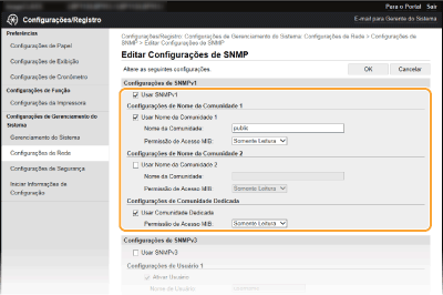 Também pode especificar definições de SNMPv1 e ativar/desativar definições de SNMPv3 em <Menu>. <Configurações de SNMP>