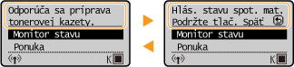 Správy sa zobrazujú na obrazovke v situáciách, keď sa napríklad minie papier alebo sa dosiahne čas životnosti kazety s tonerom.