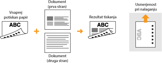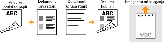 To poglavje v glavnem opisuje nalaganje potiskanega papirja v pravi smeri in postavitvi. Opis splošnega postopka nalaganja papirja v predal najdete v poglavju Vstavljanje papirja v predal ali Vlaganje papirja v večnamenski pladenj.