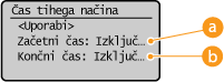 Nastavite uro za preklop iz tihega načina delovanja. Za nastavitev izberite <Vključeno> in nato določite uro.