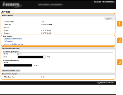Makinenin adı ve kurulum yeri de dahil olmak üzere, makineyi tanımlamak için kullanılan bilgileri kaydedebilirsiniz. Makinenin AirPrint işlevini devre dışı da bırakabilirsiniz. Bu ayarları değiştirmek için Uzak Kullanıcı Arabirimi'ni kullanın.