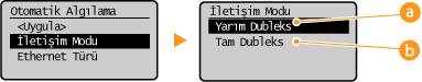 İletişim modunu seçin.![]() <Yarım Dubleks>Sırayla iletişim verileri gönderir ve alır. Makine, yarı dubleks kullanarak bir ağ aygıtına bağlandığında seçin.