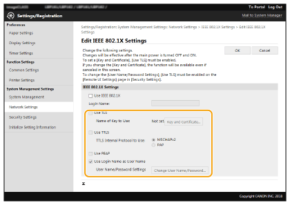 The required settings are almost the same as those of TTLS. MSCHAPv2 is used as the internal protocol. Enable TLS for the Remote UI before configuring this authentication method (
