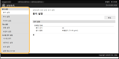 리모트 UI를 사용하여 다양한 기기 설정을 변경할 수 있습니다. 대부분의 설정을 기기에서도 설정할 수 있지만 일부 설정은 리모트 UI를 사용하여서만 설정할 수 있습니다. 이 단원에서는 리모트 UI를 사용하여 기기의 설정을 변경하는 기본 흐름을 설명합니다.