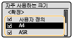 선택하지 않은 용지 크기는 용지 크기 설정 선택 화면에서 <기타 크기>를 선택해서 볼 수 있습니다.