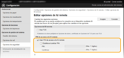Marque la casilla de verificación [Usar PIN de acceso a la IU remota] y establezca el PIN.