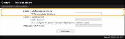 Introduzca el PIN apropiado en [PIN del administrador del sistema] para iniciar una sesión en Modo de administrador del sistema. Configuración del PIN del administrador del sistema