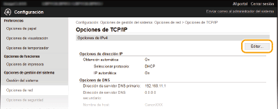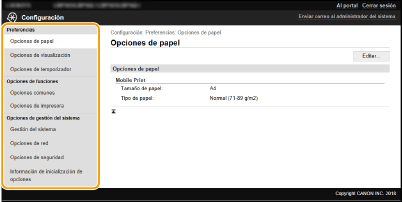 Puede cambiar las distintas opciones del equipo utilizando la IU remota. La mayoría de las opciones también pueden configurarse en el equipo, pero algunas opciones solo pueden configurarse a través de la IU remota. En esta sección se describe el flujo básico de cambio de las opciones del equipo a través de la IU remota.
