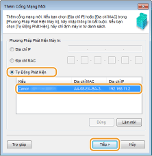 Chọn [Tự Động Phát Hiện] và chọn máy khi được phát hiện, sau đó nhấp vào [Tiếp].