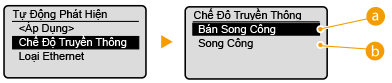 chọn chế độ truyền thông.![]() <Bán Song Công>Gửi và nhận dữ liệu truyền thông lần lượt. Chọn khi máy đã được kết nối với thiết bị mạng sử dụng giao thức bán song công.