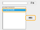 2 | 指定地址例外。 在 [要注册的地址] 文本框中输入 MAC 地址,然后单击 [添加]。 不需要用连字符或冒号来分隔地址。 ![]() 检查是否有输入错误 如果 MAC 地址输入错误,则可能无法从远程用户界面访问本机,此时需要将 <MAC地址筛选器> 设置为 <关闭>。<MAC地址筛选器> ![]() 从例外中删除 MAC 地址 选择 MAC 地址,然后单击 [删除]。 ![]() |