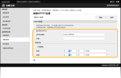 可以检查 AirPrint 设置中输入的值,例如本机的名称和位置。您可以单击 [编辑] 更改设置。