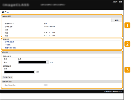 可以显示 AirPrint 画面,通过此画面,不仅可以访问 AirPrint 设置,而且可以查看墨粉盒等耗材信息。另外还可以配置安全功能设置。