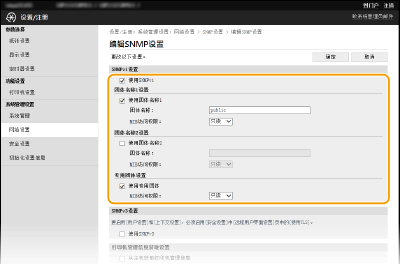 专用团体是预设团体,仅针对使用佳能软件的管理员。选中此复选框可使用专用团体,并指定 [MIB访问权限]。如果无需使用专用团体,请取消选中此复选框。