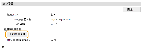 可以单击 [SNTP设置] 中的 [设置/注册]  [网络设置]  [TCP/IP设置]  [检查NTP服务器],查看与注册服务器的通信状态。如果已经建立正确的连接,结果将显示如下。请注意,该操作不会调整系统时钟。