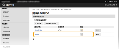 無法刪除正在使用的金輪和憑證,例如「[TLS]」顯示於 [鍵值使用] 下方時。在這種情況下,請先停用此功能或更換金輪和憑證,然後再加以刪除。