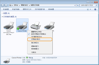 以右鍵按一下本機的印表機驅動程式圖示,然後按一下 [印表機內容] 或 [內容]。