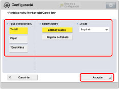 Si establiu [Treball], [Estat de treballs], [Imprimir] com a Pantalla predeterminada (Monitor estat/Cancel·lar):