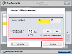 Premeu [On] per a <Lectura intel·ligent> → premeu [-] o [+] per a <Nre. caràct. per a nom fitxer OCR> per establir el nombre de caràcters del nom de fitxer → premeu [Bé].