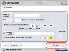 Podeu establir i desar un nom i un PIN per a una bústia, així com especificar el temps que ha de passar perquè s'eliminin automàticament els fitxers d'aquesta bústia.