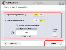 Premeu [On] per imprimir automàticament l'informe de gestió de comunicacions quan el nombre de transmissions d'enviament i recepció arribi a 100.