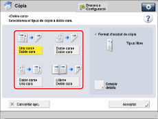 Doble cara], seguiu les instruccions que apareixen a la pantalla per llegir cadascuna de les cares dels originals.Si voleu col·locar l'original de doble cara al vidre per copiar amb l'opció [Doble cara
