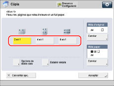 Aquest mode permet imprimir diversos originals llegits o originals a doble cara perquè encaixin en un sol full de paper. Podeu disposar 2, 4 o 8 originals llegits en una pàgina. També podeu configurar les còpies a doble cara i canviar el disseny i l'ordre de les imatges.