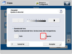 Si ajusteu la densitat del fons prement [Ajustar] per a <Densitat del fons>, l'opció [Auto] es cancel·la. De la mateixa manera, si premeu [Auto] mentre feu ajustos manuals a [Ajustar], els ajustos es cancel·laran. La màquina ajusta automàticament la densitat perquè coincideixi amb la del fons.