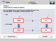 Per copiar text o línies amb més claredat, heu de triar una posició propera a [Alt] per a l'àrea de text. Per copiar originals que continguin fotografies impreses o altres imatges de tons mitjans, heu d'apropar la configuració a [Baixa] per a l'àrea de foto/imatge.