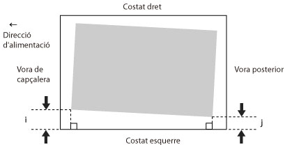Si la imatge impresa apareix inclinada, es possible que pugueu corregir la imatge desalineada justificant els marges d'"i", que és la distància de la vora esquerra del paper a l´àrea d'impressió i "j".