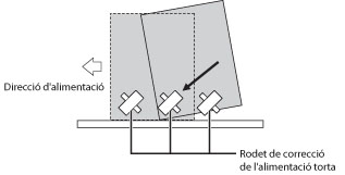 El rodet de correcció de l'alimentació torta es troba a la unitat d'alimentació del motor de marcatge i permet ajustar la posició desada del paper que s'introdueix a l'equip prement el paper diagonalment contra la paret de dins de la unitat d'alimentació. Si el nivell de correcció de l'alimentació torta no està ben configurat, la imatge impresa sortirà torta.