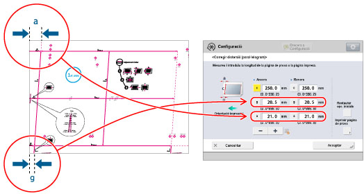 Torneu a la pantalla <Corregir distorsió (paral·lelogram)> → introduïu la longitud mesurada d'[G] i [A] per a l'anvers i el revers.